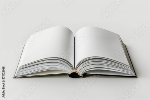 Open blank book with white pages on a white background. Perfect for design, advertising, or educational purposes.