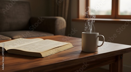 hot drink, cup, book, table, wooden, open, page, steam, warm, light, home, interior, day, window, reading, relaxation, quiet, calm, peaceful, atmosphere, coffee table, education, learning, relaxing, beverage, hot, drink, comfortable, interior design, living room, couch, furniture, still life, light brown, soft light, photo, closeup, lifestyle, morning, afternoon