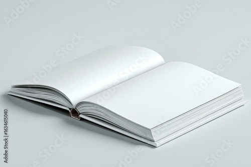 book, open, page, white, blank, grey, surface, studio, light, empty, reading, cognition, literature, education, learning, text, paper, print, design, illustrative, digital, three-dimensional, render, image, modern, simple, clean, minimalist, object, still, life, composition, layout, perspective, geometry, symmetry, solid, monochromatic, brown, binding, spine, illustration, presentation, template