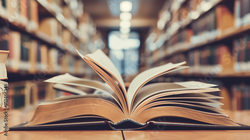 Open book on table in a quiet library setting