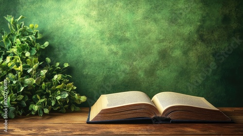 book, literature, reading, plant, nature, wooden, table, open, education, study, cognition, greenery, botany, foliage, text, page, environment, learning, wisdom, natural, desktop, leaf, flora, decoration, rustic, green, paper, object, storytelling, material, background, area, interior, design, scene, view, peaceful, calmness, lifestyle, still, life, space, indoor, concept, scholarly, copy space
