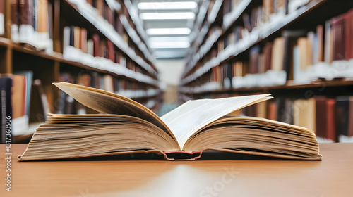 Open Book on Wooden Table in Library Setting With Rows of Bookshelves in Background Highlighting Education and the Joy of Reading