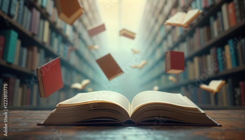 Open book rests on wooden table amidst flying books in library setting. Books of various colors, sizes float in air. Open book appears to in focus, showing pages of text. Library setting softly out