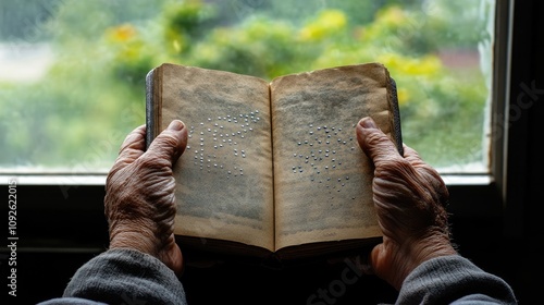 book, braille, hand, reading, elderly, texture, window, nature, light, education, accessibility, cognition, learning, literacy, warmth, page, silent, story, vision, finger, print, dark, soft, care, wisdom, heritage, language, history, open, tradition, tactile, emotion, memory, quiet, indoor, detail, age, contrast, mood, peaceful, calm, environment, depth, wellness, sharpened