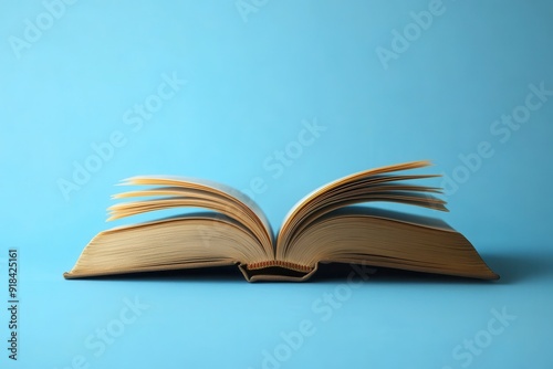 Open book with flipping pages against a bright blue background, knowledge, reading, literature, education, study.