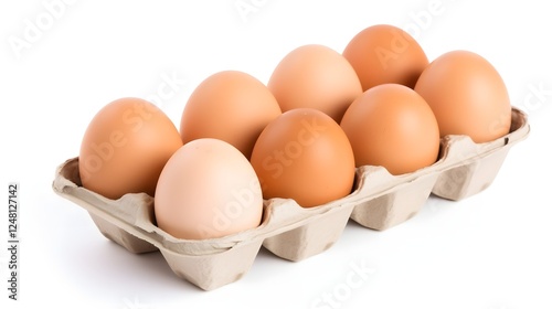 Open carton of fresh organic eggs revealing the interior contents on a simple clean white background Minimalist still life style image showcasing the natural texture and pattern of the eggs