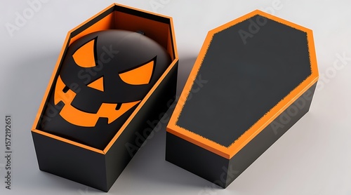 halloween, coffin, pumpkin, skittish, scarey, holiday, celebration, decoration, party, trick or treat, night, dark, orange, black, open, closed, lid, container, box, design, graphic, illustration, concept, symbol, traditional, autumn, fall, seasonal, event, fun, creepy, eerie, haunted, ghostly, sorcerer, monster, vampire, zombie, supernatural, mystery, fear, gothic