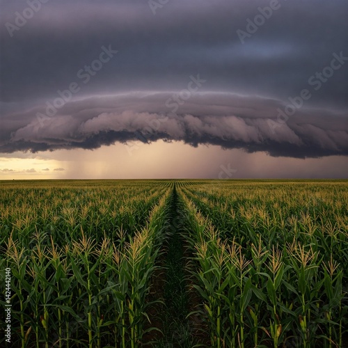 Open cornfield in Iowa with storm clouds gathering, dramatic Midwest farming scene.