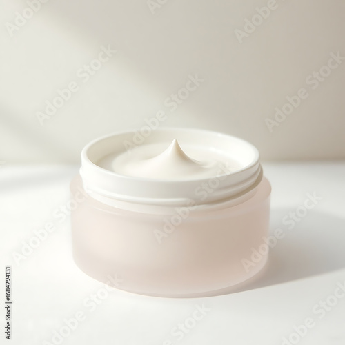 cream, cosmetic, jar, open, white, lotion, skincare, minimalist, light, clean, moisturiser, beauty, product, beauty product, moisturise, cosmetic product, health care, wellness, natural light, studio shot, closeup, bright light, professional, advertising, marketing