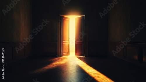 door, light, open, room, dark, entry, exit, way, out, bright, shadow, beam, sun, ray, sunshine, hope, future, new, beginning, opportunity, passage, freedom, escape, mystery, unknown, interior, wood, floor, paneling, wall, design, gold, glow, warm, doorway, archway, entrance, corridor, architecture, hallway, hall, building, hotel, window, tunnel, long, perspective, old, house