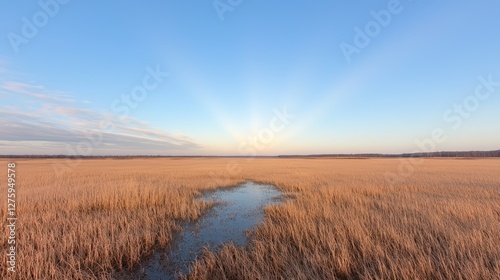 field, marsh, sunrise, nature, tranquil, scenic, view, open, water, grass, sky, landscape, calm, peaceful, gold, horizon, dawn, sunlight, morning, beautiful, empty, serene, golden hour, winter, autumn, meadow, wetland, wildlife, wilderness, outdoors, rural, panorama, photo, imagery, photo, viewpoint, photographic, beauty, travel, vacation, relaxation