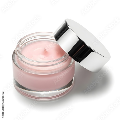cream, cosmetic, skincare, beauty, moisturiser, lotion, jar, container, product, pink, silver, lid, cap, glasses, cardboard box, treatment, face, body, hygiene, personal, care, wellness, health, freshness, clean, smooth, texture, soft, gentle, natural, organic, luxury, premium, studio, shot, object, detail, macro, sharpened