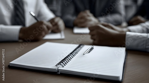 Open notebook and pen on a table during a business meeting with blurred professionals in background
