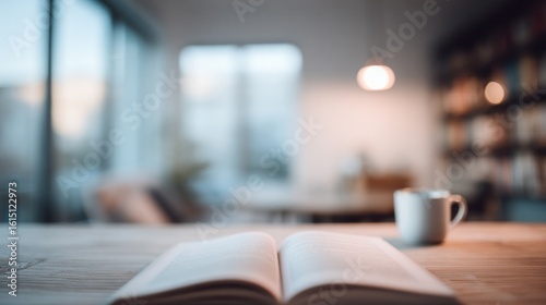 Open Notebook on Desk with Coffee Mug in Blurred Office Background