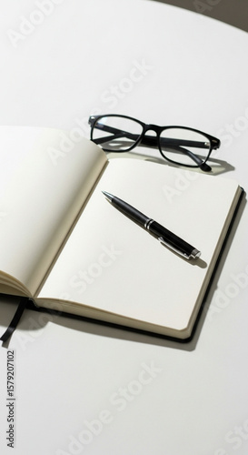 Open notebook with pen and glasses on clean white table