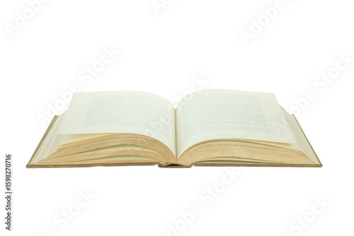 Open old vintage book representing knowledge, education, and storytelling. A classic novel or bible for study, research, or learning history and wisdom. isolated on white background with clipping path