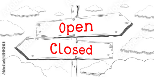 open, closed, signpost, crossroad, guidepost, signs, 2, arrow, direction, cloud, pointer, sky, outline, cartoon, wooden, text, word, concept, white background, drawing, vignetting, red, illustration