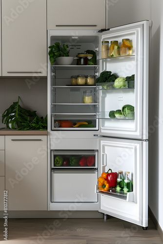 Open refrigerator with groceries, fresh vegetables and drinks inside. Well-organized fridge