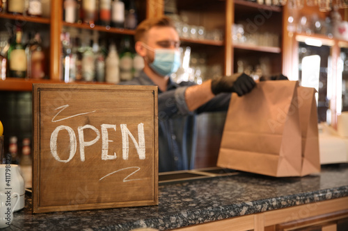OPEN sign and blurred view of waiter with takeout orders on background. Food service during coronavirus quarantine