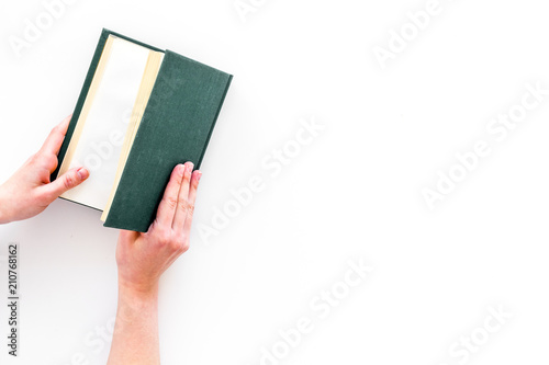 Open the book. Hands hold hardback book opened on white background top view copy space