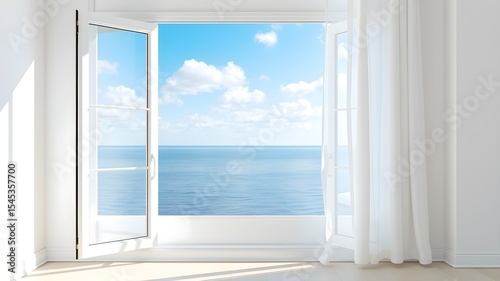 Open window with ocean view and blue sky on a sunny day in bright minimal white room interior