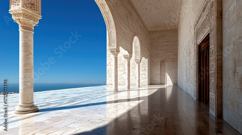 archway, colonnade, pillar, exterior, light, stone, marble, ocean, view, blue, sky, sunlight, shadow, architecture, islam, arabesque, corridor, perspective, symmetry, detail, balcony, patio, white, calm, travel, summer, vacation, trip, holiday, historical, ancient, grand, imposing, monumental, facades, porch, open, horizon, peaceful, mediterranean, serene, empty, daylight, structure, elevation, coastal, building, traveler