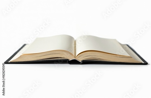 Opened black hardcover book on white studio background. Blank, empty pages ready for text or design. Vintage, retro style for education, literature, history, or design template purposes.