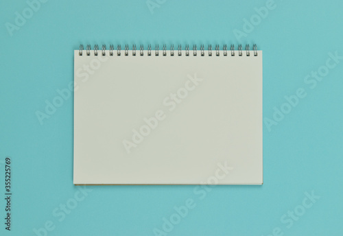 Opened empty notebook on blue background. Top view. copy space.