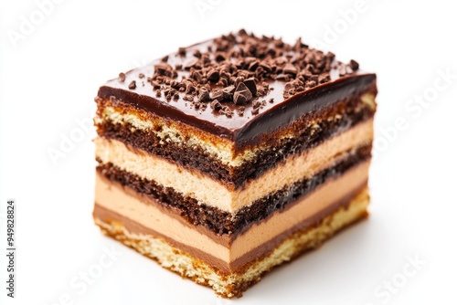 Opera Cake, A French layered cake with coffee-soaked almond sponge, coffee buttercream, and chocolate ganache. Isolated on White Background