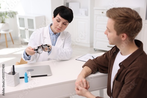 Ophthalmologist consulting young man at white table in clinic