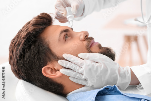 Ophthalmologist putting drops in young man's eye at hospital, closeup