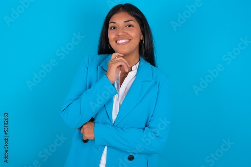 Optimistic Young latin woman wearing blue blazer blue background keeps hands partly crossed and hand under chin, looks at camera with pleasure.