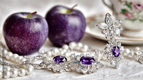 Opulent diamond and amethyst jewelry rests near deep purple apples and fine china