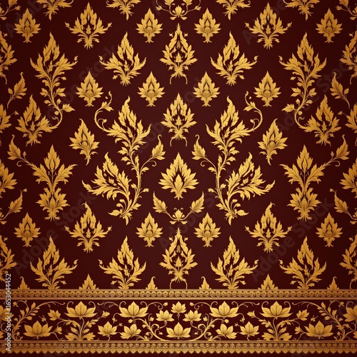 pattern, floral, sense, feature, intricate, repeating, gold, motif, against, dark, rich, background, primary, design, stylised, leaf, ornamental, figure, arranged, creating, elegance, luxury, decorative, horizontal, border, bottom, more