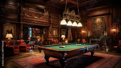 opulent, pool, table, room, illustration, luxurious, luxury home, grand, high, ceiling, ornate, rich, wood, paneling, pristine, center, elegant, furnishing, artwork, billiard, ball, leather, chair, decor, lighting, ambience, classic, sophisticated, exclusive