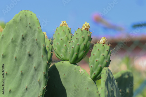 Opuntia ficus-indica. Frutti di fico dìIndia in maturazione sulla pianta.