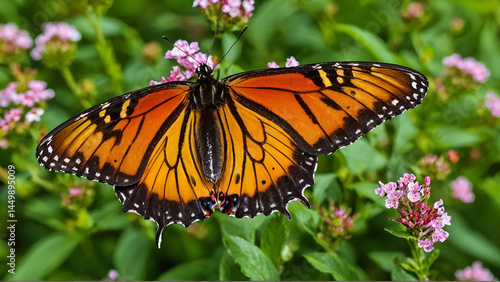 orange and black butterfly resting in the flower garden, Generative AI