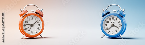 clock, alarm, alarmclock, alarmclock, horologe, timer, time, 2, retro, vintage, blue, orange, background, urgent, day, night, double, bipolar, time management, balance, white, gradient, deadline, arousing, sleep, analog, alert, classic, reminder, concept, watch, wide, panoramic, metal, old-fashioned, old-fashioned, render, three-dimensional, illustration