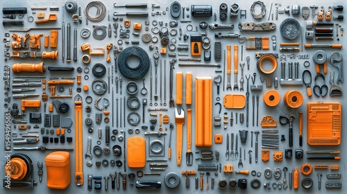 tool, part, orange, grey, metal, plastic, nut, bolt, screw, wrench, plier, tape, socket, machinery, industrial, design, collection, pattern, geometric, organised, detailed, precision, equipment, hardware, component, construction, repair, maintenance, workshop, mechanical, engineering, technology, industry, manufacturing, modern, abstract, composition, texture, surface, object, arrangement, isometric, grid, order, system