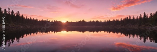 Orange and pink hues of sunset reflected in a calm lake surface, peaceful, calm, breeze