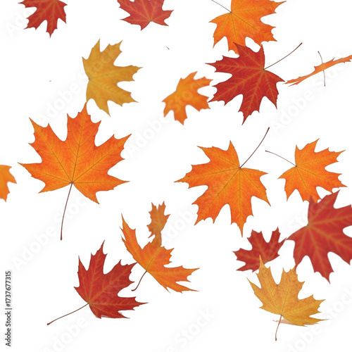 Orange and red autumn maple leaves falling, 3D illustration, white background