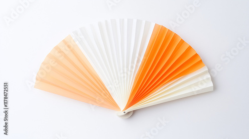 Orange and White Hand Fan: A vibrant, half-orange and half-white hand fan, elegantly displayed. Perfect for summer themes, adding a touch of elegance and coolness.