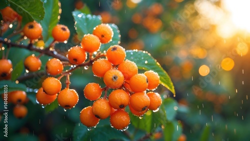 berry, tree branch, droplet, water, leaf, growing, flocked, orange, botany, flora, foliage, sunlight, wet, raining, autumn, season, nature, outdoors, plant, macro, closeup, detail, shining, fresh, vibrant, natural, dew, garden, bush, texture, background, pattern, backlit, branching, ripening, dew-drop, sun, green, healthy