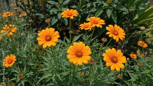 orange, flower, garden, green, background, nature, freshness, spring, flower petals, floral, arrangement, exterior, decoration, fence, leaf, vibrant, beauty, bloom, plant, growth, colourful, scene, bright, foliage, botanical, summer, seasonal, landscape, lush, cheerful, nurture, elegant, blossom, wildflower, natural, design, aesthetic, texture, serenity, capture, view, peaceful, high-coloured, flora, environment, charming, delightful, open