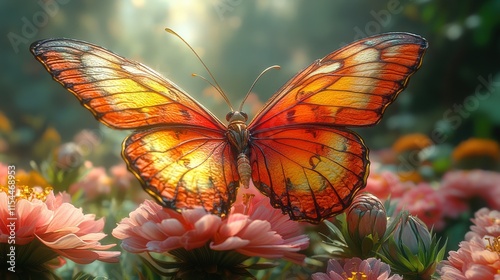 butterfly, insect, wing, flower, blossom, bloom, flower petals, orange, pink, nature, garden, summer, spring, sunlight, light, colours, vibrant, beautiful, delicate, fragile, wildlife, animal, macro, closeup, flora, fauna, arthropod, lepidoptera, pollination, antennae, body, leg, environment, ecosystem, beauty, art, design, background, wallpaper, image, photo, illustration, digital, graphic, pattern, texture, scene