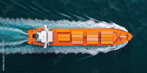 cargo, ship, container, ocean, sea, vessel, deck, water, arousing, aerial, top, view, orange, transportation, freight, shipping, maritime, movement, industrial, horizon, voyage, marin, export, import, logistic, journey, commercial, route, international, harbor, coast, day, sunlight, sky, stern