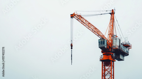 Orange construction crane against a clear sky, showcasing industrial architecture and engineering detail in a minimalist urban setting.