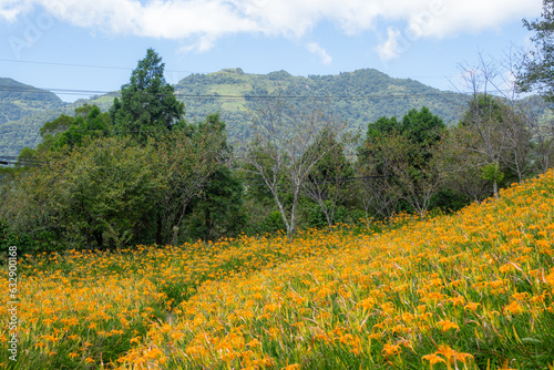 Orange daylily flower field in Taimali Kinchen Mountain in Taitung of Taiwan