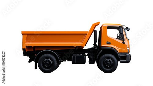 Orange dump truck side view with detailed features on transparent background