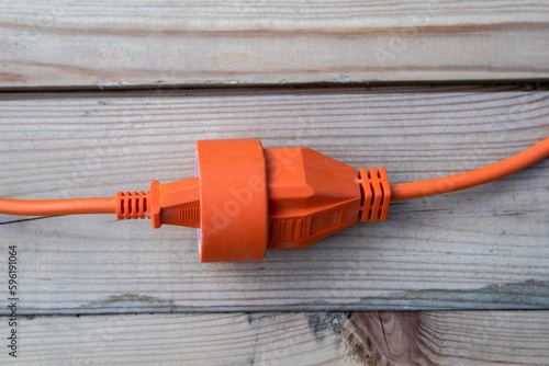 Orange electric wire, cable or extension cord on wood texture background